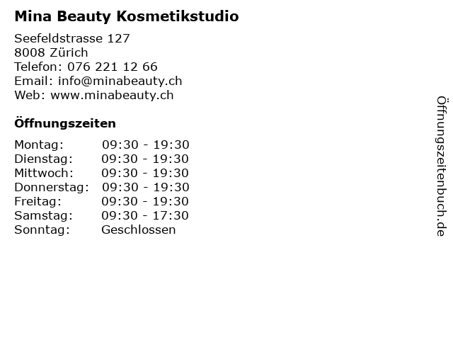 | Öffnungszeiten Mina Beauty Kosmetikstudio in Zürich anzeigen | |