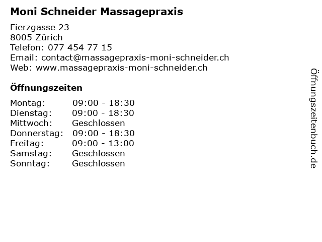 | Öffnungszeiten Moni Schneider Massagepraxis in Zürich anzeigen | |