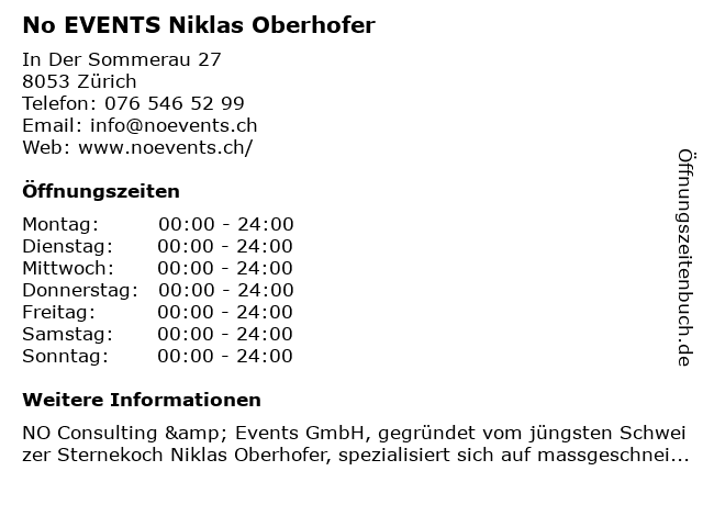 | Öffnungszeiten No EVENTS Niklas Oberhofer in Zürich anzeigen | |