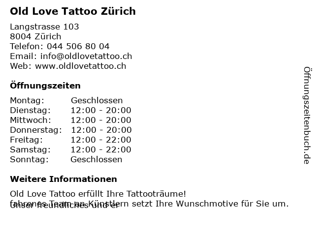 | Öffnungszeiten Old Love Tattoo Zürich in Zürich anzeigen | |