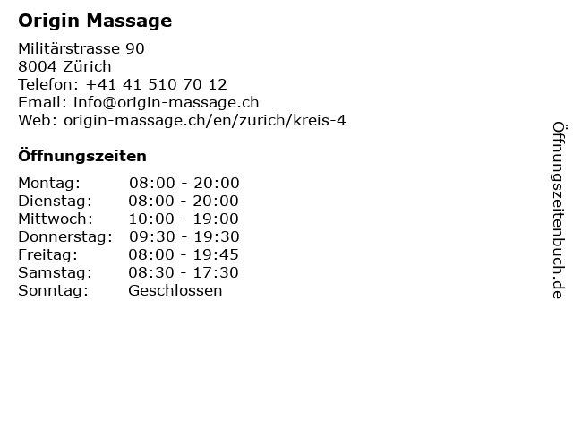 Origin Massage in Zürich: Telefonnummer, Öffnungszeiten und Adresse