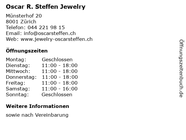 | Öffnungszeiten Oscar R. Steffen Jewelry in Zürich anzeigen | |