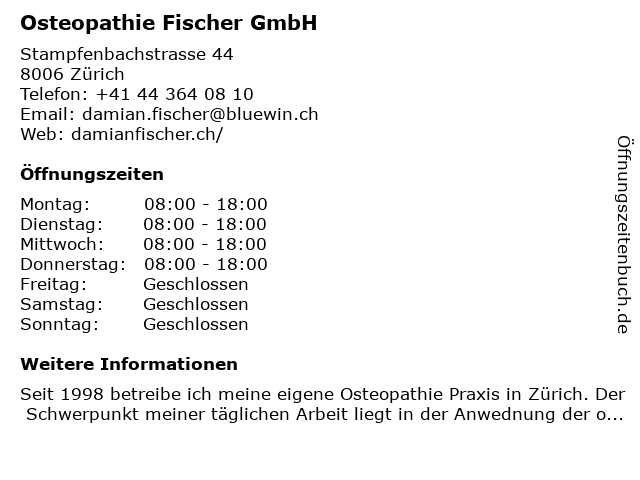 | Öffnungszeiten Osteopathie Fischer GmbH in Zürich anzeigen | |
