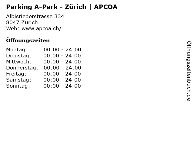 | Öffnungszeiten Parking A-Park - Zürich | APCOA in Zürich anzeigen | |