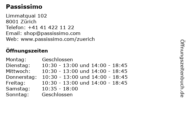 | Öffnungszeiten Passissimo in Zürich anzeigen | |