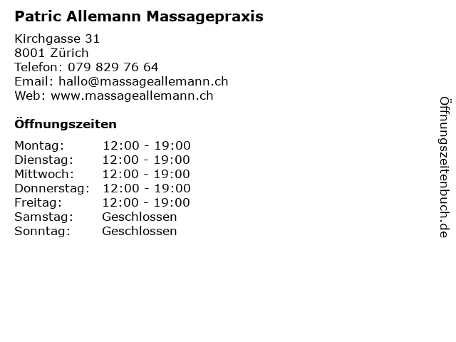 | Öffnungszeiten Patric Allemann Massagepraxis in Zürich anzeigen | |