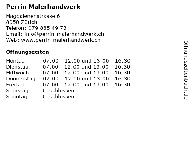 | Öffnungszeiten Perrin Malerhandwerk in Zürich anzeigen | |