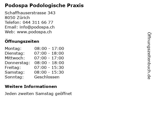 | Öffnungszeiten Podospa Podologische Praxis in Zürich anzeigen | |