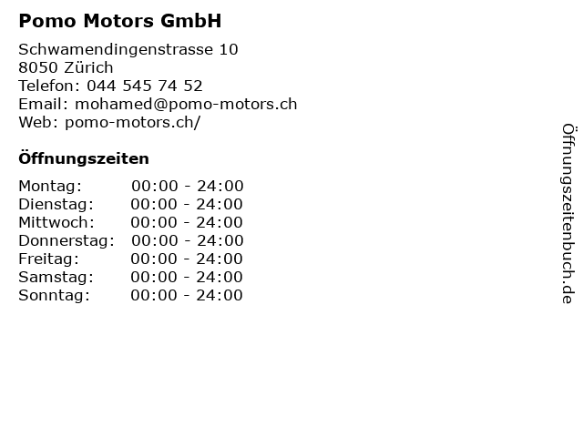 | Öffnungszeiten Pomo Motors GmbH in Zürich anzeigen | |