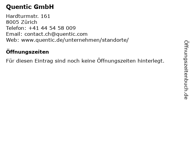 | Öffnungszeiten Quentic GmbH in Zürich anzeigen | |