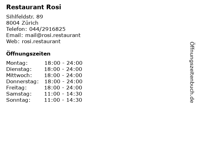 | Öffnungszeiten Restaurant Rosi in Zürich anzeigen | |