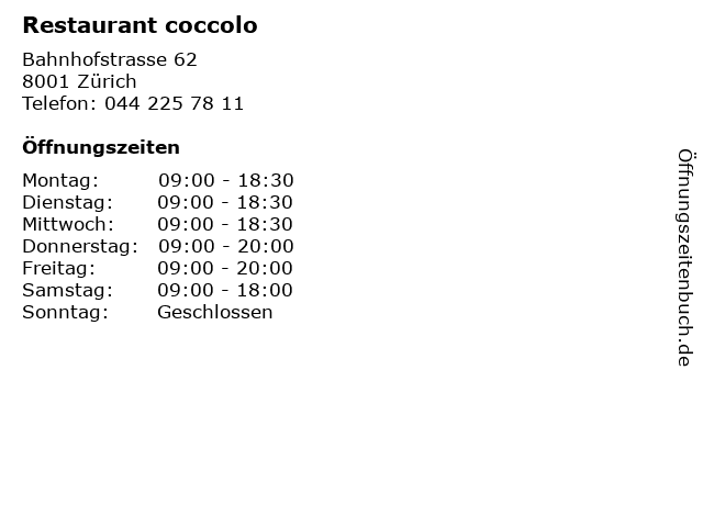 | Öffnungszeiten Restaurant coccolo in Zürich anzeigen | |