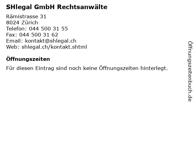| Öffnungszeiten SHlegal GmbH Rechtsanwälte in Zürich anzeigen | |