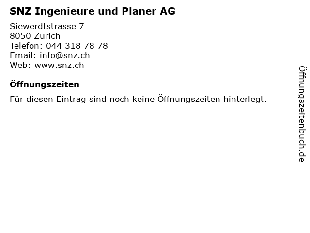 | Öffnungszeiten SNZ Ingenieure und Planer AG in Zürich anzeigen | |