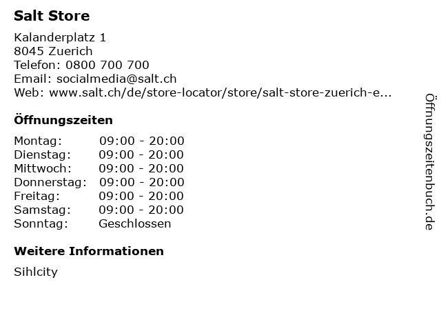 | Öffnungszeiten Salt Store in Zuerich anzeigen | |