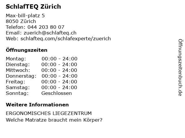 | Öffnungszeiten SchlafTEQ Zürich in Zürich anzeigen | |