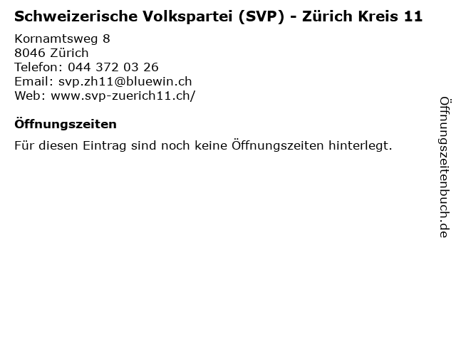 Branchen & Suchbegriffe zu Schweizerische Volkspartei (SVP) - Zürich Kreis 11:11, kreis, parteien, politik, schweizerische, svp, volkspartei, zürich |
