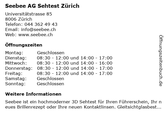 | Öffnungszeiten Seebee AG Sehtest Zürich in Zürich anzeigen | |