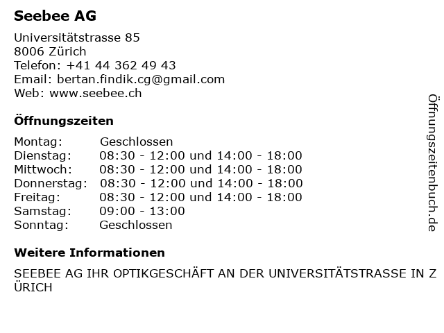 | Öffnungszeiten Seebee AG in Zürich anzeigen | |
