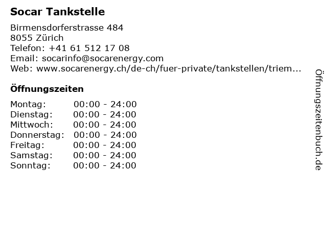 | Öffnungszeiten Socar Tankstelle in Zürich anzeigen | |
