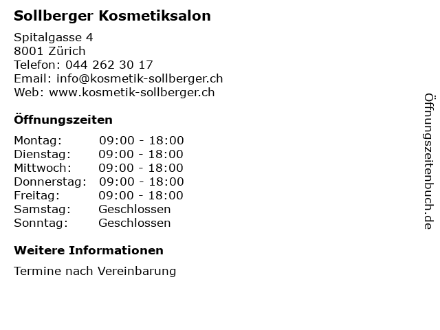 | Öffnungszeiten Sollberger Kosmetiksalon in Zürich anzeigen | |