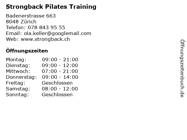 | Öffnungszeiten Strongback Pilates Training in Zürich anzeigen | |