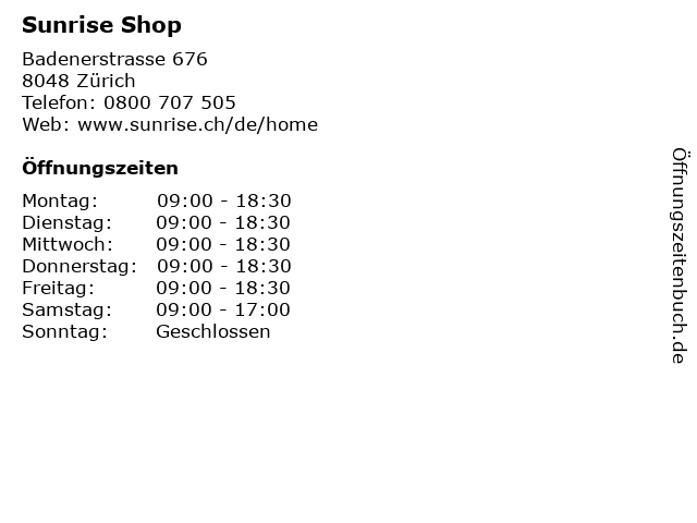 | Öffnungszeiten Sunrise Shop in Zürich anzeigen | |