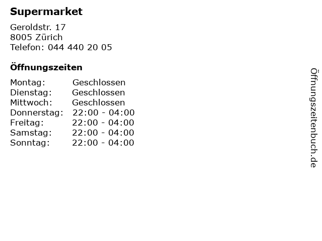 | Öffnungszeiten Supermarket in Zürich anzeigen | |