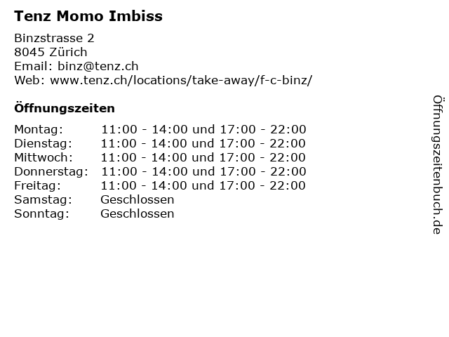 | Öffnungszeiten Tenz Momo Imbiss in Zürich anzeigen | |