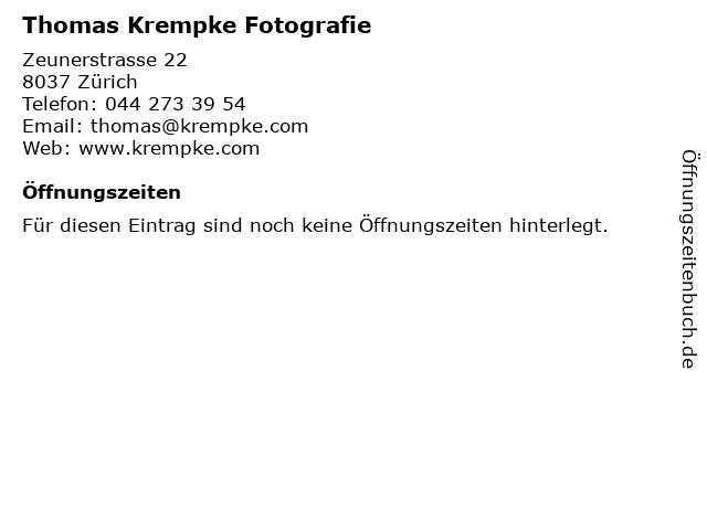 | Öffnungszeiten Thomas Krempke Fotografie in Zürich anzeigen | |