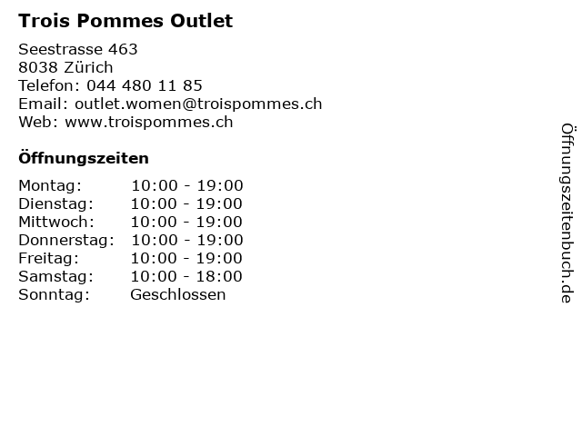 | Öffnungszeiten Trois Pommes Outlet in Zürich anzeigen | |