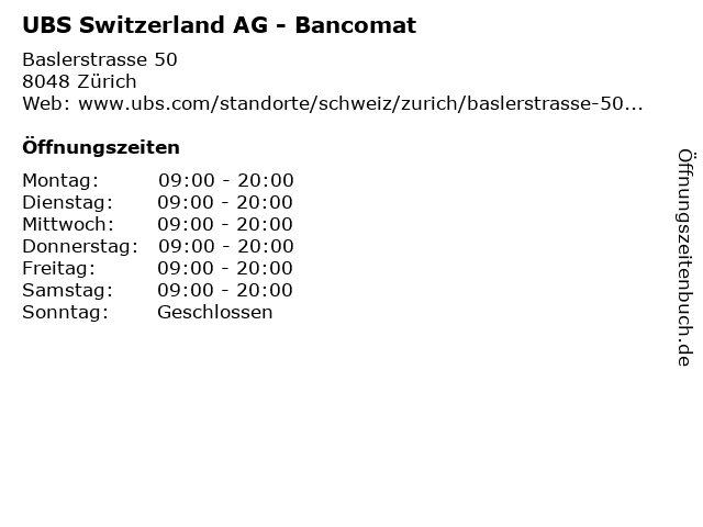| Öffnungszeiten UBS Switzerland AG - Bancomat in Zürich anzeigen | |