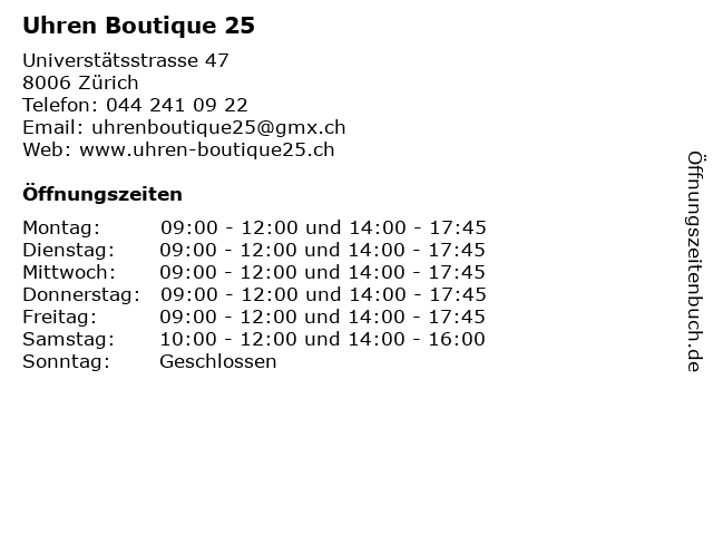 | Öffnungszeiten Uhren Boutique 25 in Zürich anzeigen | |