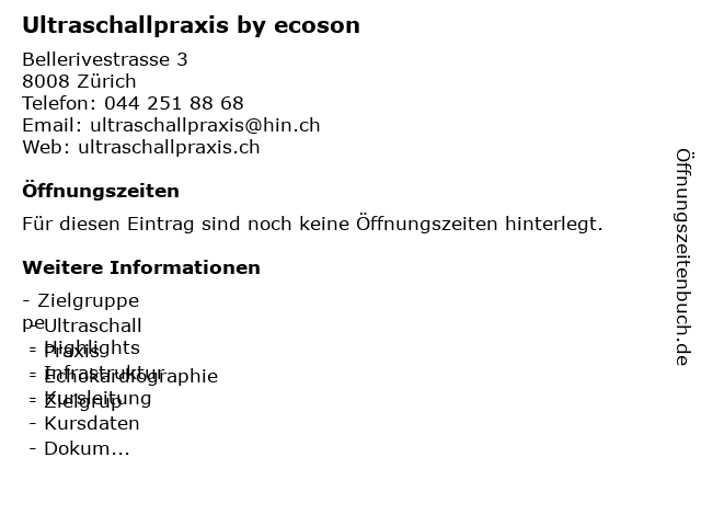 | Öffnungszeiten Ultraschallpraxis by ecoson in Zürich anzeigen | |