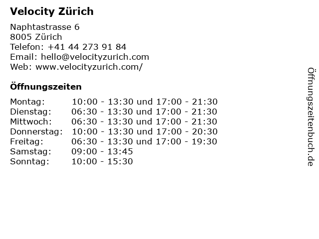 | Öffnungszeiten Velocity Zürich in Zürich anzeigen | |