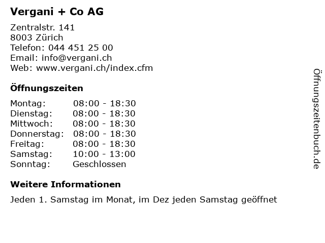 | Öffnungszeiten Vergani + Co AG in Zürich anzeigen | |