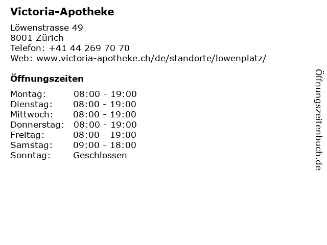 | Öffnungszeiten Victoria-Apotheke in Zürich anzeigen | |