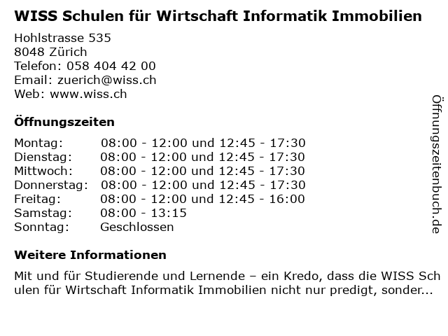 Branchen & Suchbegriffe zu WISS Schulen für Wirtschaft Informatik Immobilien:ausbildungszentrum, immobilien, informatik, schulen, wasserwerke, wirtschaft, wiss |