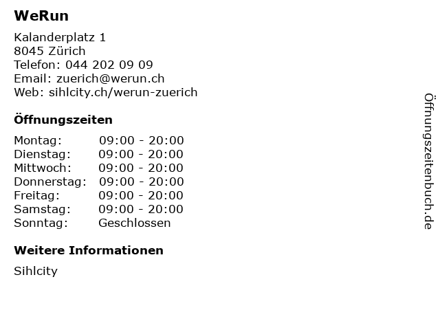 | Öffnungszeiten WeRun in Zürich anzeigen | |