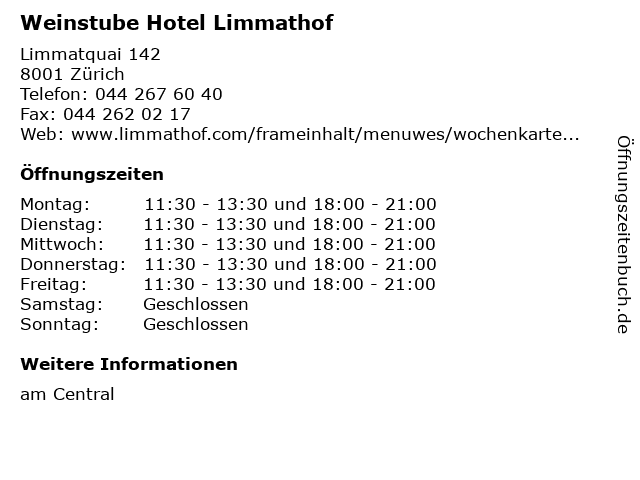 | Öffnungszeiten Weinstube Hotel Limmathof in Zürich anzeigen | |