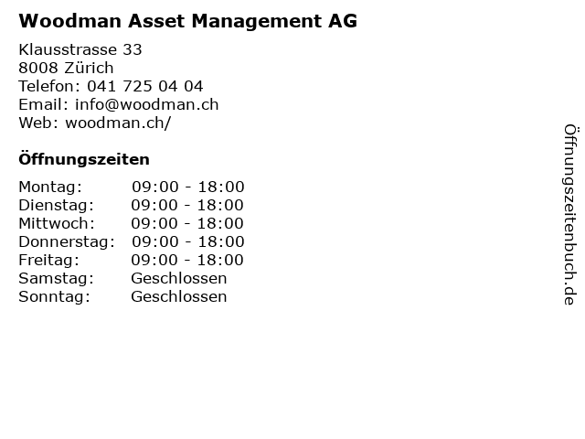 | Öffnungszeiten Woodman Asset Management AG in Zürich anzeigen | |