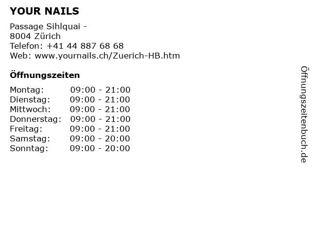 | Öffnungszeiten YOUR NAILS in Zürich anzeigen | |
