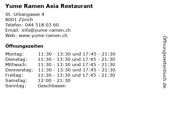 | Öffnungszeiten Yume Ramen Asia Restaurant in Zürich anzeigen | |