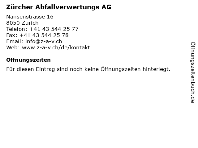 | Öffnungszeiten Zürcher Abfallverwertungs AG in Zürich anzeigen | |