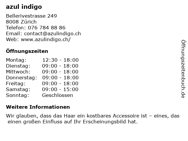 | Öffnungszeiten azul indigo in Zürich anzeigen | |