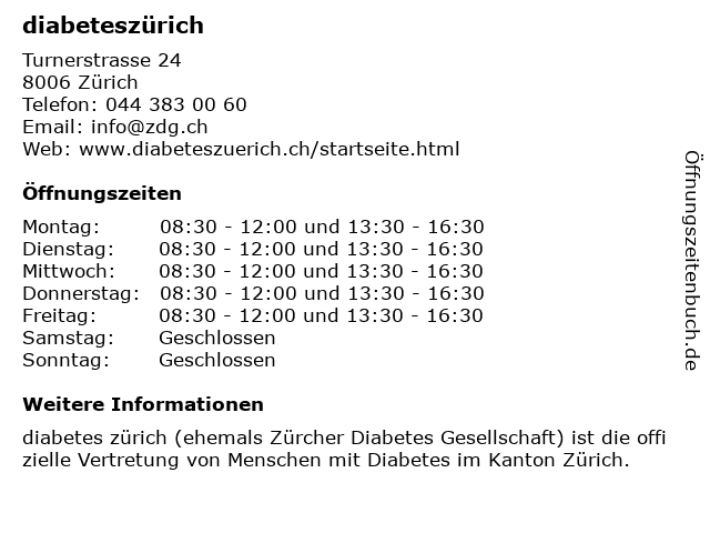 | Öffnungszeiten diabeteszürich in Zürich anzeigen | |