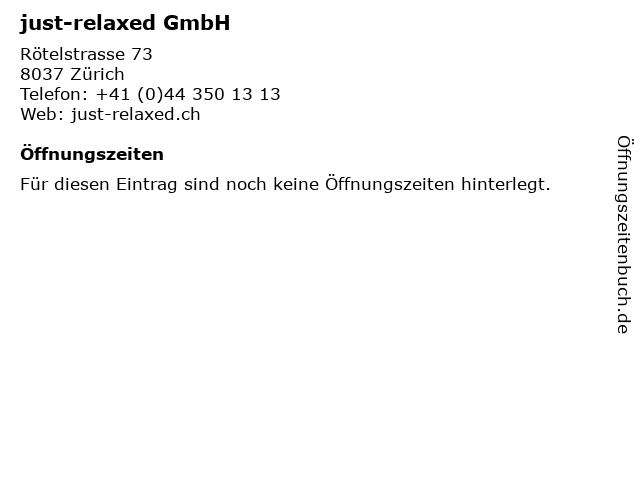 | Öffnungszeiten just-relaxed GmbH in Zürich anzeigen | |