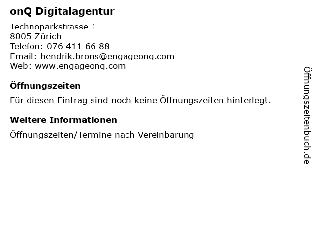 | Öffnungszeiten onQ Digitalagentur in Zürich anzeigen | |