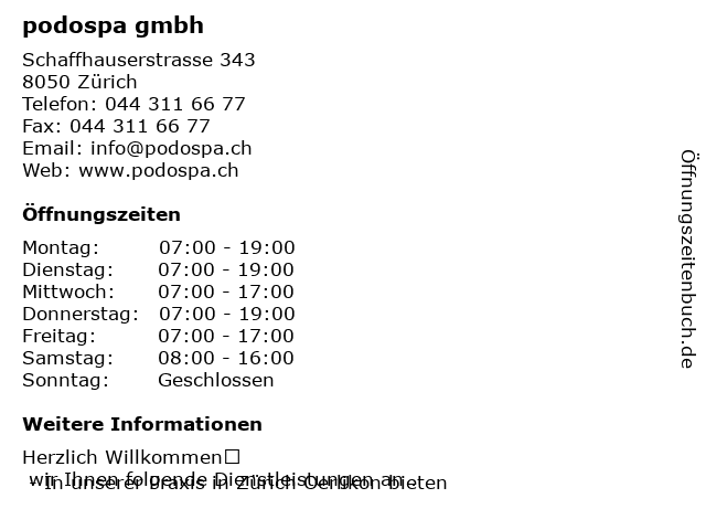 | Öffnungszeiten podospa gmbh in Zürich anzeigen | |