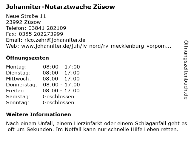 Öffnungszeiten Johanniter-Notarztwache Züsow in Züsow anzeigen | |